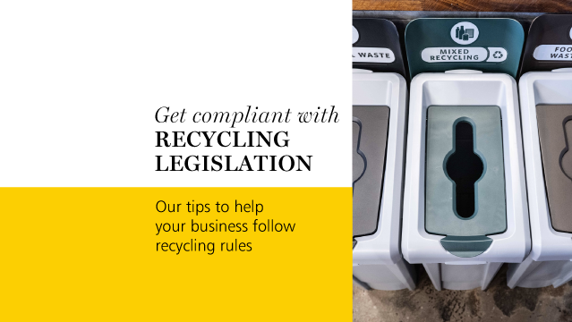 The new legislation requires dry recyclable materials, such as glass bottles, drinks cans, food containers, paper and cardboard, food waste and eventually (from March 2027) plastic film to be separated from general waste. In order to be compliant, businesses must ensure that they are separating these waste streams.
