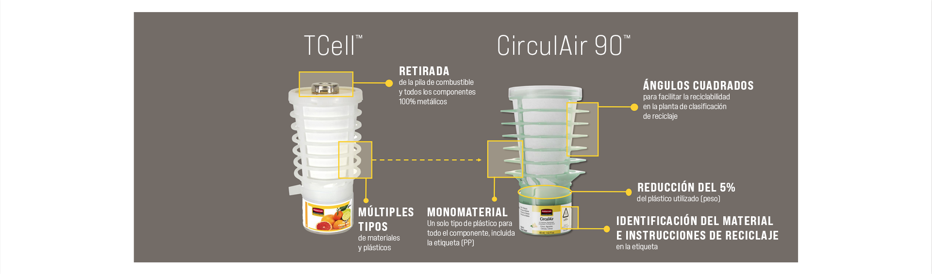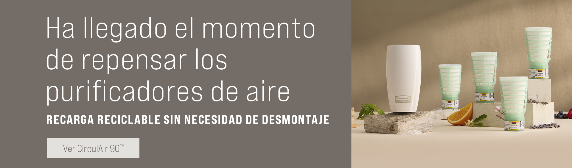 CirculAir 90™ es un sistema de purificación de aire pasivo que utiliza el flujo de aire ambiente para mover la fragancia por la habitación sin necesidad de pilas. Cabe en el mismo dispensador que TCell™.