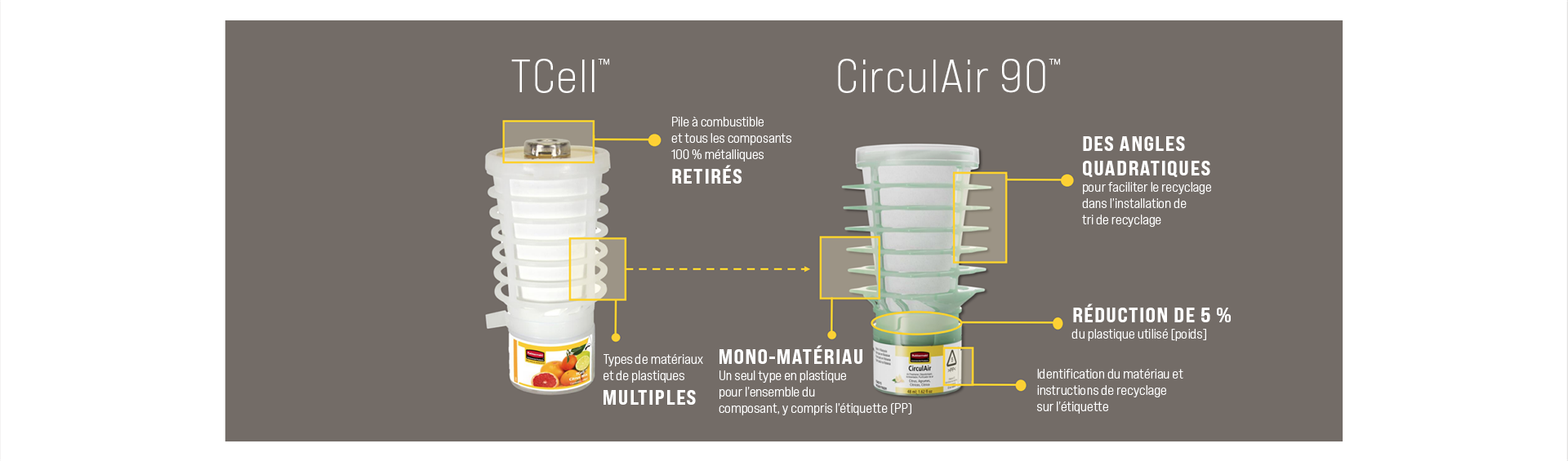 Une étude mondiale sur le secteur des produits d’hygiène de l’air montre que les entreprises et les ménages préfèrent les solutions de soin de l’air respectueuses de l’environnement et dont l’emballage est recyclable**. Le système CirculAir 90™ est entièrement fabriqué en polypropylène, un mono-matériau recyclable.