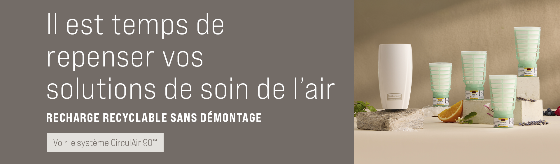 CirculAir 90™ est une solution passive de soin de l’air, conçue pour aider les entreprises confrontées à la pression croissante imposée par les objectifs de développement durable. Recyclable, sans pile et certifié en l'UE, au Royaume-Uni, en Norvège et en Suisse, ce produit permet de profiter de 90 jours de parfum avec une empreinte environnementale plus faible que son prédécesseur.