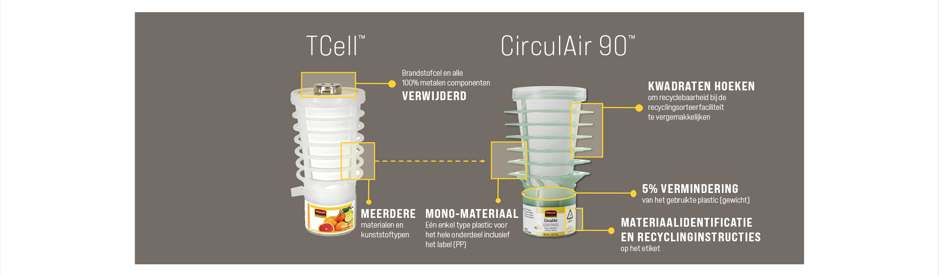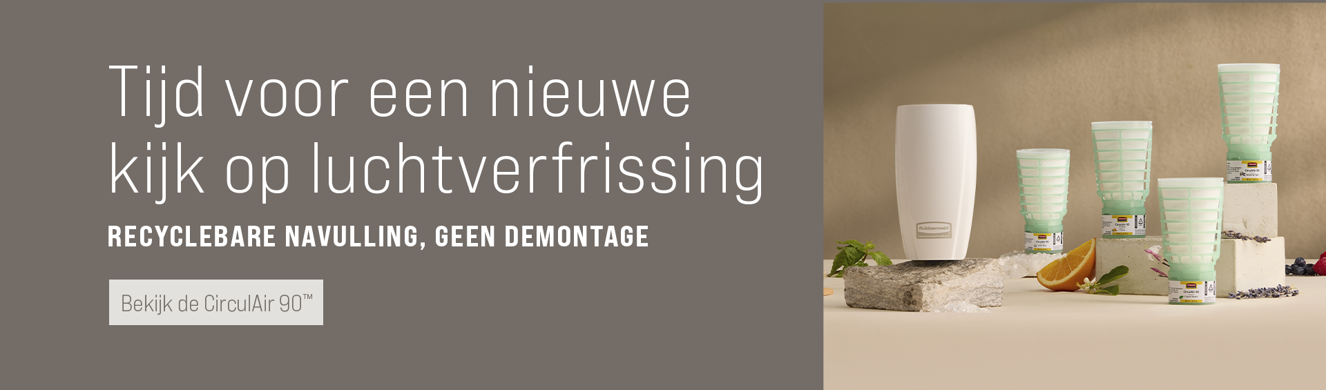 De CirculAir 90™ is een passief luchtverfrissingssysteem dat bedrijven helpt die onder toenemende druk staan om te voldoen aan duurzaamheidsdoelstellingen. Hij is recyclebaar, bevat geen batterijen en is gecertificeerd in de EU, het Verenigd Koninkrijk, Noorwegen en Zwitserland. Hij geeft 90 dagen geur af met een kleinere ecologische voetafdruk dan zijn voorganger.